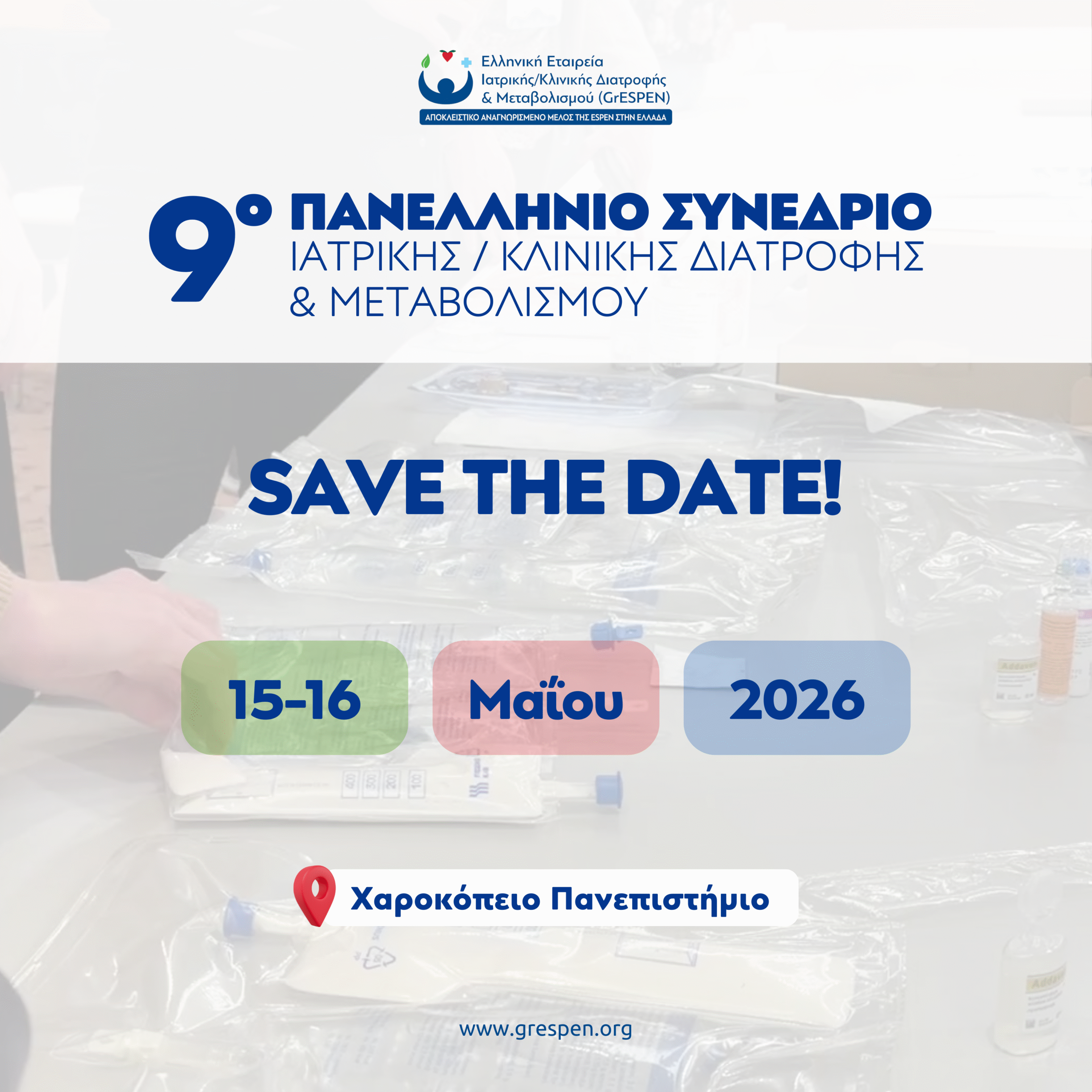 Η Ελληνική Εταιρεία Ιατρικής/Κλινικής Διατροφής και Μεταβολισμού – GrESPEN έχει τη χαρά να σας ανακοινώσει τη διεξαγωγή του 9ου Πανελλήνιου Συνεδρίου Ιατρικής/Κλινικής Διατροφής και Μεταβολισμού,